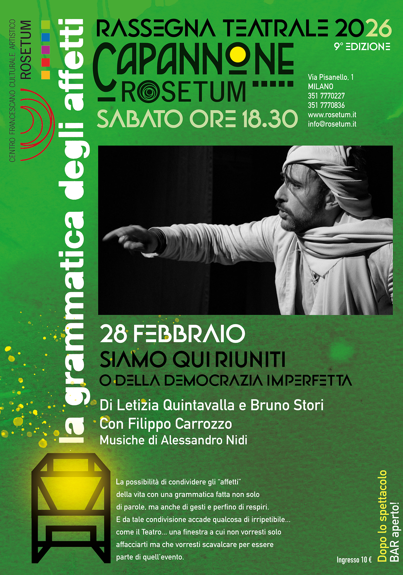 “Siamo qui riuniti o della Democrazia imperfetta” è uno spettacolo che parla di politica in senso alto, con il rigore della ricerca storica e la profonda leggerezza del riso e dell’ironia.